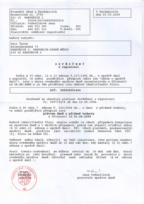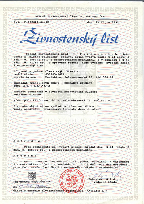 Dokumenty k nahlédnutí: [ živnostenský list ] [ registrace plátce DPH ]
